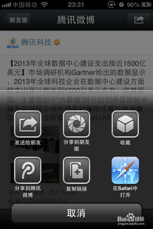 然后点击你需要分享的文章。我以腾讯微博推送的一篇文字为例。然后我们点击右上角的分享符号。