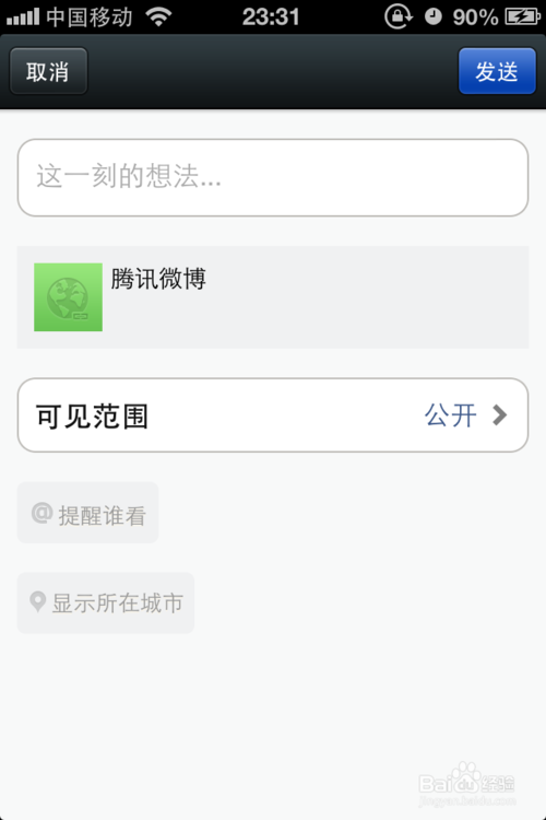 然后进入下面的界面,我们输入我们想说的话,相信很多人到这一步就知道了。和转发新浪微博界面一样,操作也一样,如图。输入内容后,点击发布。