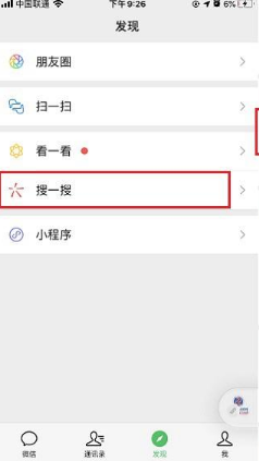 1.在手机上点击打开微信,在微信开发页面点击“搜索”。