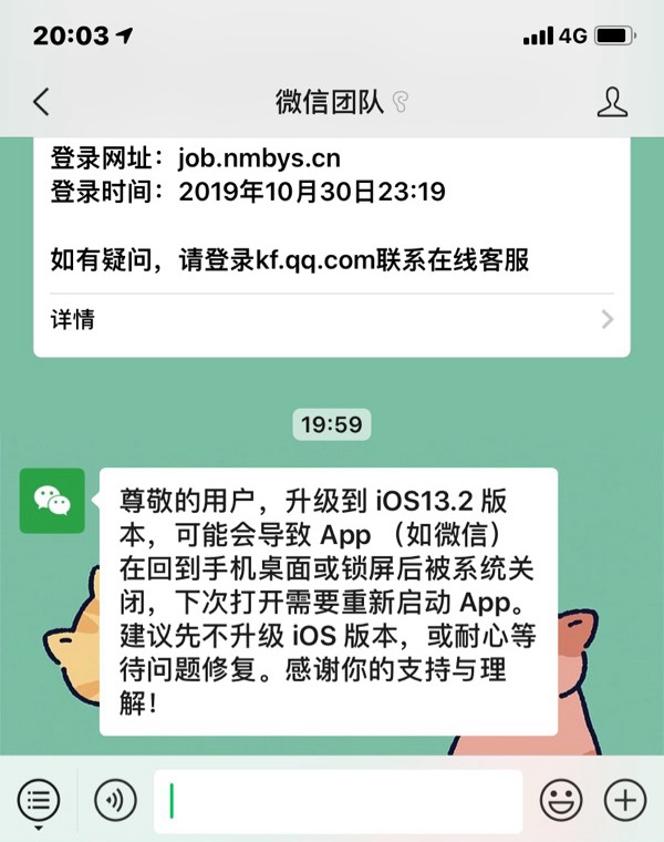 11月1日消息,针对iOS 13.2系统中频繁爆发的后台查杀问题,微信团队今日发布公告:尊敬的用户,升级到iOS 13.2版本可能会导致应用(如微信)返回移动桌面或锁定屏幕。然后就被系统关闭了,下次打开需要重新启动应用程序。建议暂时不要升级iOS版本,或者耐心等待问题修复。感谢您的支持和理解!
