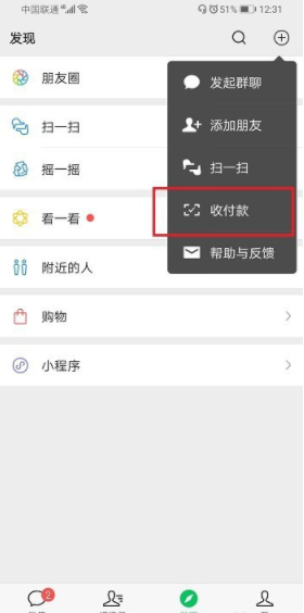 第一步,打开微信。进入后点击+图标,选择付款,如下图: