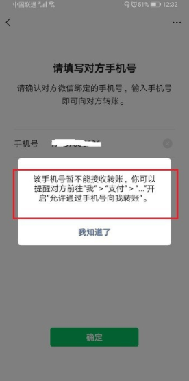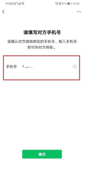第三步,输入对方微信绑定的手机号码,点击确定,如下图: