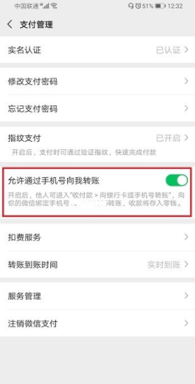 第五步,开通手机号码转账。在微信支付管理中,启用手机号码给我转账,如下图: