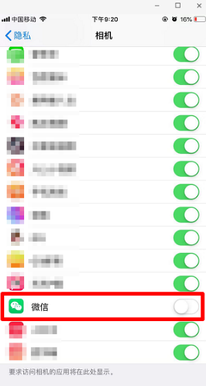 这里的微信是关闭的,也就是微信不允许使用摄像头,所以用微信扫描就会变成黑屏。只需点击微信右侧的按钮即可打开。
