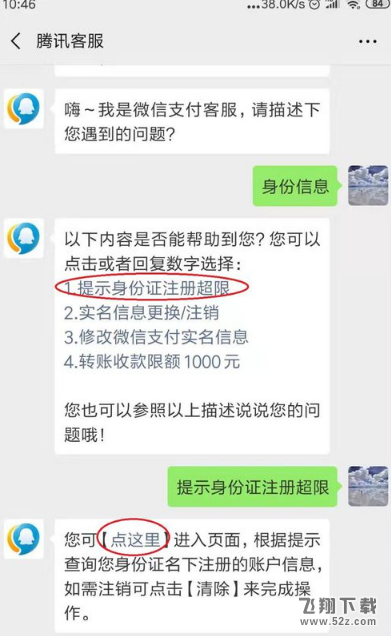然后在对话框中输入“身份信息”,会出现四个选项。选择“1.提示身份证登记超限”选项。下面会提示“Click here”进入页面,点击进入。