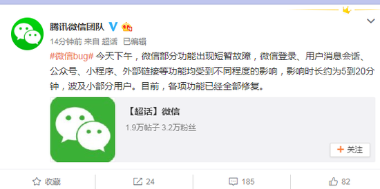 据6月5日消息,腾讯微信团队官方微博表示,今天下午,微信部分功能出现暂时性故障。微信登录、用户消息会话、公众号、小程序、外部链接等功能均受到不同程度的影响。持续时间约为5至20分钟,影响少数用户。目前,所有功能均已修复。