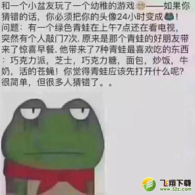 问:有一只绿青蛙早上七点还在看电视。突然,有人敲了七下门。原来是青蛙的好朋友带来了惊喜的早餐。他带来了7种青蛙最喜欢的东西:巧克力。馅饼、奶酪、巧克力糖、面包、炒饭、活苍蝇!你认为青蛙应该先打开什么?很简单,但很多人都猜错了。