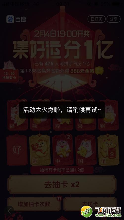 为了获得这888只金猪,用户热情异常高涨。今天,百度APP又更新了一波抽卡机会。今天0:00开始,部分用户在抽卡时被提示“活动太火爆,请稍后重试~”。