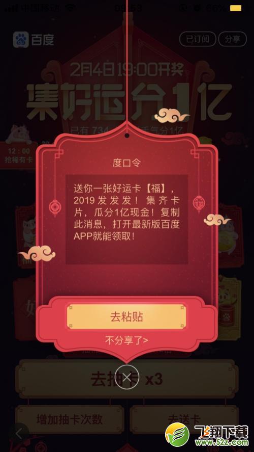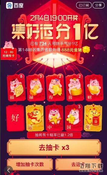 百万好运活动中,百度App用户在抽奖前集齐十张“福禄寿福禄大吉”卡,即可参加抽奖,赢取亿元红包。 2月4日19:00开奖。其中,前888名集齐所有金币的用户还可额外获得限量版金猪一只。