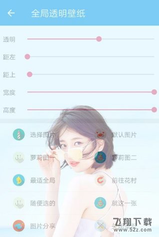 2、接下来,从手机本地相册中选择要设置的透明壁纸后,还可以通过进度条调整壁纸的透明度、方向、宽度和高度。