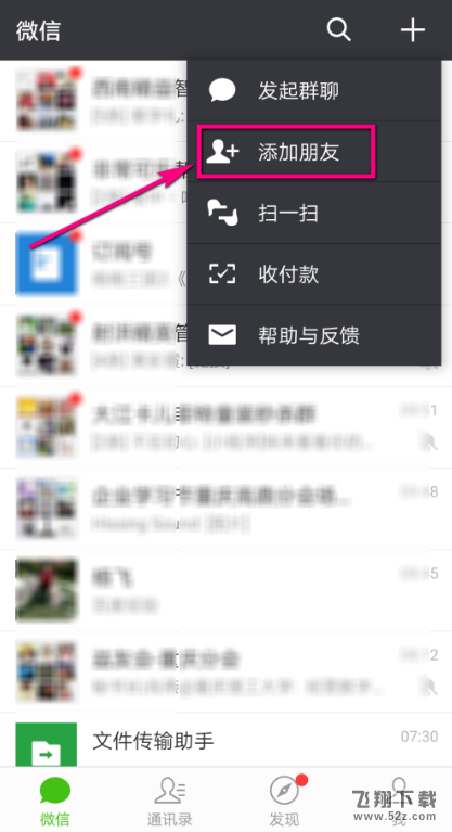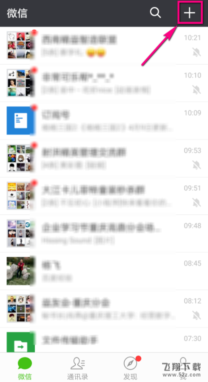 在手机上打开微信,进入聊天信息页面,点击右上角的加号,如图。