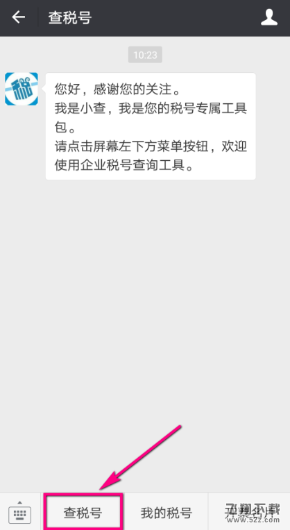 添加并关注公众号,进入公众号聊天页面,点击下方【查看税号】按钮。