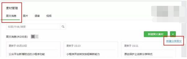 在图文编辑页面,添加图文时可以选择“共享图文”。共享的文章可以放在“图文列表”的任意位置,也可以单独推送。