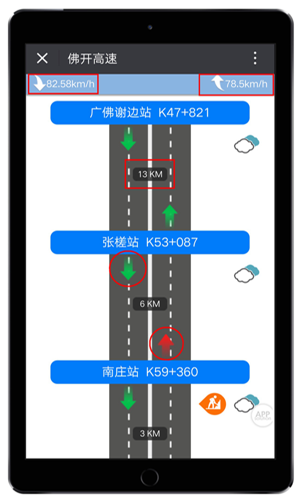 点击“施工”图标,界面会弹出道路施工的具体情况,给居住在佛山、广州的人们一个回家的提醒。