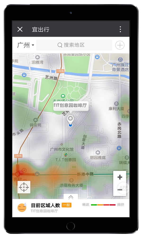 城市热力图是一款实时反映人群聚集状况的大数据可视化产品。打开“城市热力图”我们可以看到哪里人流量比较多。 (当然,这个操作的执行次数是有限制的!如果访问太频繁,当天就会被视为恶意请求,不会显示热度图标。)