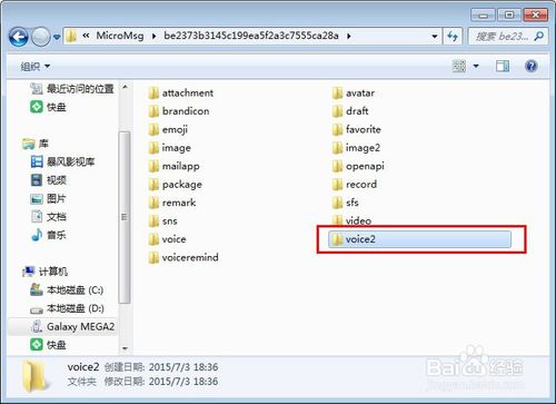 1将手机连接到电脑上,然后你会在电脑上看到手机所在位置的盘符。我的手机是三星手机。插上电脑后会看到一个Galaxy MegA2的图标,双击打开。然后在手机盘符下输入“Tencent \ micromasg”,我们看到这里有三个32字名字的文件夹,也就是说这个手机上已经登录了三个微信号,我们点击任意一个打开。