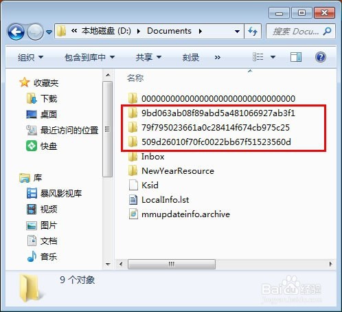 我们打开刚才保存的路径,因为我保存在D盘的根目录下,所以我们打开“D:\Documents”可以看到几个由32个字符组成的文件夹,每个文件夹代表一个微信号。如下图,手机上登录了三个微信号(全零的文件夹是微信系统文件,不是聊天记录文件)。