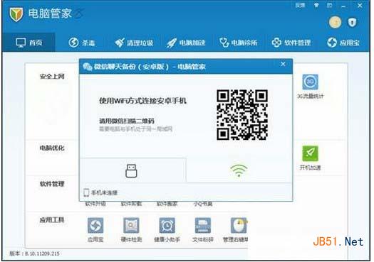1。在电脑管家工具箱里找到“微信聊天备份”功能。打开后可以选择USB连接或者WIFI连接。