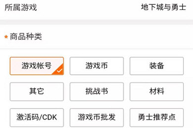 3、例如,如果出售的账号是《地下城与勇士》,则会出现相应的产品类型,包括游戏中的主流物品、游戏账号等,只需选择相应的类型和区域服务器即可。
