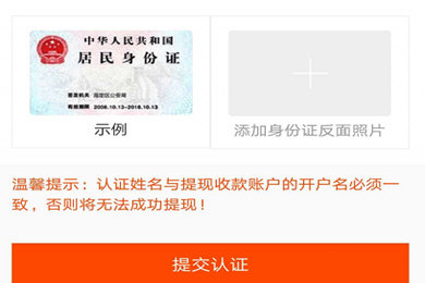 3.最后一步是最重要的一步。通过上传身份证正反面照片,然后等待官方审核,认证用户即可完成绑定。但需要提醒用户的是,绑定的身份证信息必须与绑定的银行卡账户持有人信息一致。如果先绑定别人的银行卡开户,就无法绑定身份证。同理,如果你先绑定身份证,再绑定银行卡,一定是你开户的银行卡。