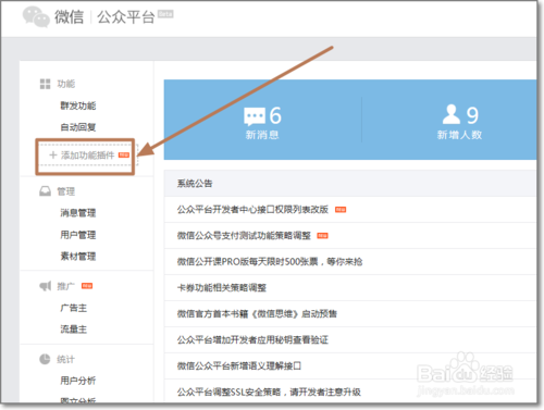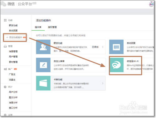 进入公共平台管理界面,选择“添加功能插件”,点击打开。