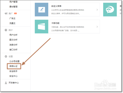 我的账号没有通过认证,所以弹出如下提示。现在需要返回公众平台主界面进行微信认证。