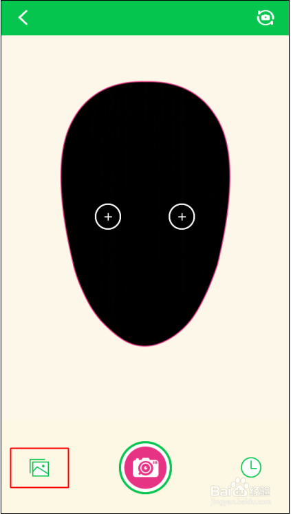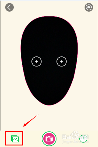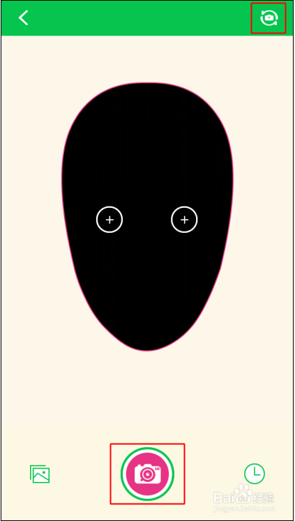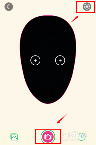 点击Mojime单人动态表情进入制作界面,可以看到一个人头的形状,MojiMe默认开启手机前置摄像头,方便我们自己拍照。点击右上角的切换摄像头按钮,切换到后置摄像头给朋友拍照,点击中间的摄像头图标拍照,如下图所示。