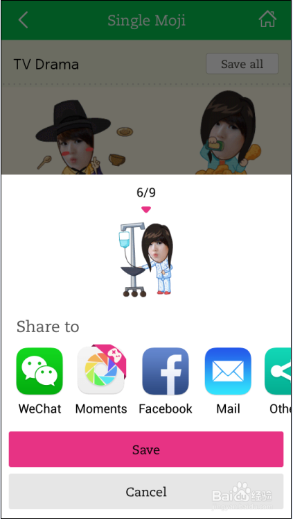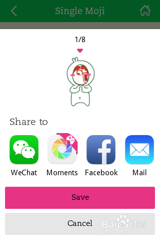 选择自己喜欢的表情后,会弹出一个新的页面,然后点击微信图标。如果要分享到微信,可以点击保存保存,点击取消取消保存。