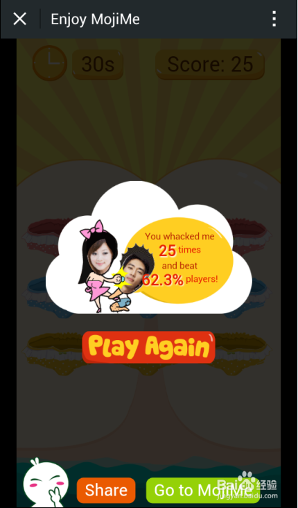 如何将MojiMe表情分享到微信朋友圈?微信MojiMe不仅可以用照片自定义动态表情,还可以将制作好的MojiMe表情分享到朋友圈后生成一个游戏链接,类似于打鼹鼠的游戏。您或您的朋友点击朋友圈的MojiMe链接后,会生成一个新的MojiMe游戏页面。在规定的30秒内,手指弹出的表情都算。你还在犹豫什么?赶紧和朋友PK一下MojiMe游戏的比分吧!下面分享一下如何在朋友圈玩MojiMe表情包。