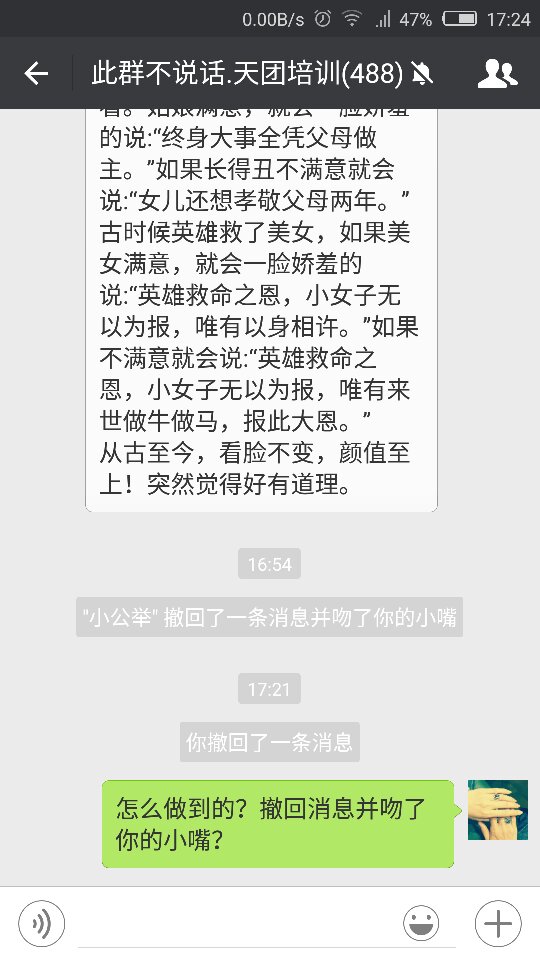 很多朋友今天早上收到XXX的消息,亲了你一下。这个游戏怎么玩?其实就是把微信昵称的Unicode码改了一下而已。比如你的朋友有一个好友昵称叫,把名字复制粘贴到自己的微信昵称上,然后把名字部分改成自己的。动作部分的修改需要闪回输入。比如“宝贝撤了条消息亲了你”可以换成“天才撤了条消息亲了你”。赶紧去玩吧,不然就没了。