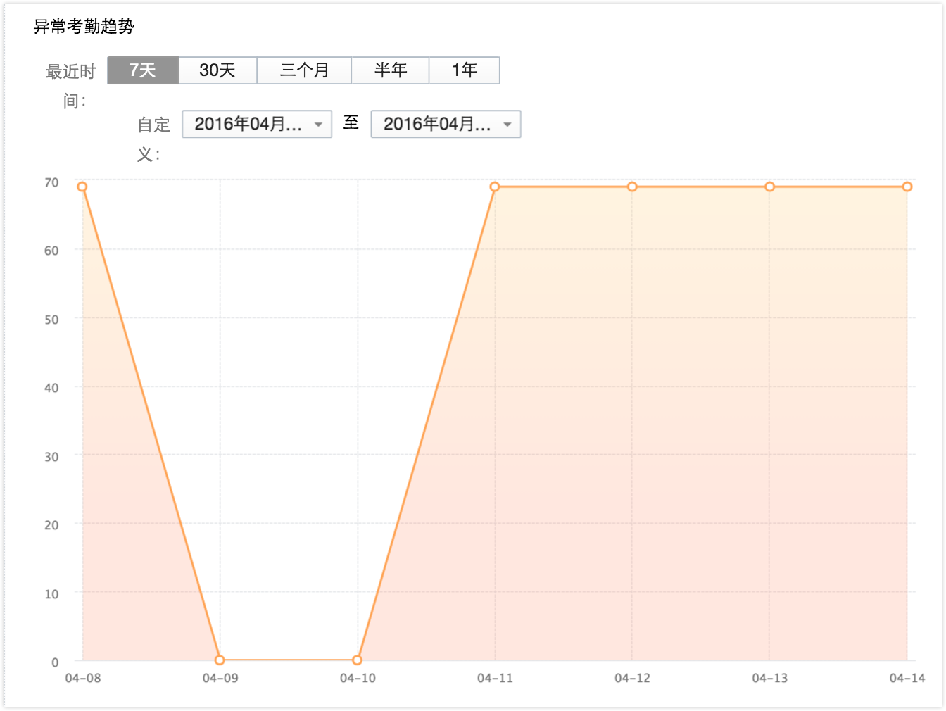 2.异常出勤趋势可以过滤不同时间段的异常出勤人数。点击某一天可以看到当天的详细情况,点击非正常出勤人数可以直接查看当天所有非正常出勤的员工列表。