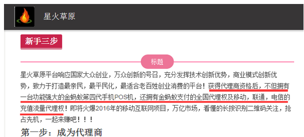 网上流传的星火草原的介绍视频是这样说的:星火草原是北京飞影软航空科技有限公司耗资6000万元打造的微信上新推出的流量和POS商城。给流量充值,卖手机POS机套现信用卡,是三大电信运营商(中国移动、中国电信、中国联通)的业务。