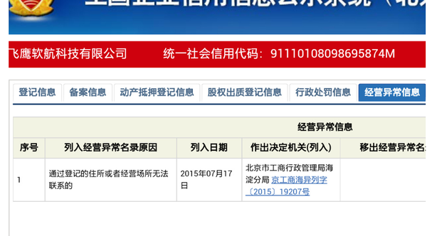 记者还查询了全国企业信用信息公示系统。这家名为北京飞影软航科技有限公司的企业早在2015年7月就被北京市工商行政管理局列入经营异常名录。
