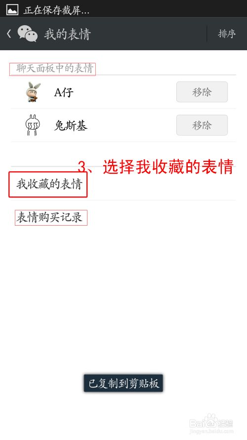 第三步在表情管理界面,我们看到有三个表情状态栏,分别是:聊天面板中的表情、我喜欢的表情、表情购买记录。因为我们是在添加自己喜欢的表情,所以选择第二个:我喜欢的表情。