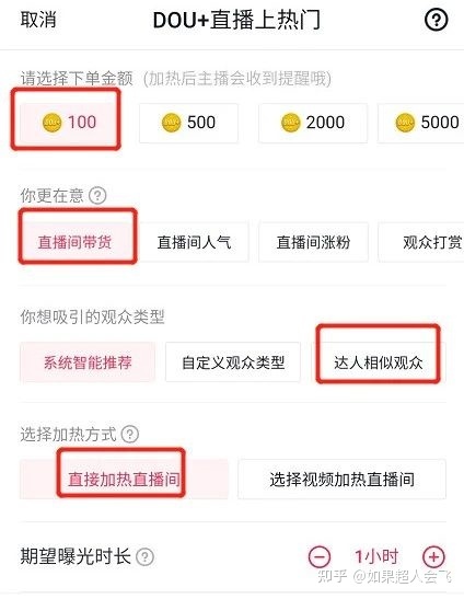 给直播间贴标签,尽量选择直播间直接加热,然后选择5-10个货量大的类似账号。同样,放入1100个小颗粒,每小时100个;