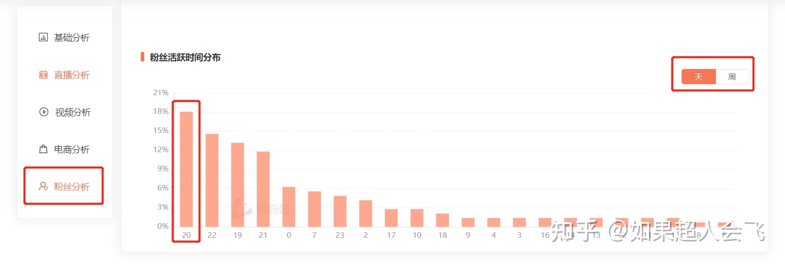 在Zen Mom中查看搜索你的账号名称,点击粉丝分析查看我们账号中粉丝的日/周活跃时间。比如这个账号的粉丝日活跃时间是20点,我们的短视频就可以在这个时间发布。