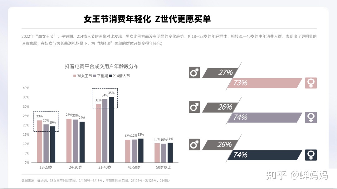 对比2022年“三八女王节”、平售期、214情人节的画像发现,男女比例没有明显的变化趋势,但18-23岁的年轻群体比31-40岁的中年消费群体表现出更明显的消费意愿。