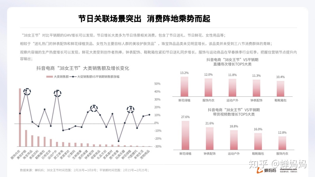 对比平淡销售期的GMV增长,“三八女王节”可以发现,大部分节日增长品类都与节日场景有关,包括节日礼品、节日鲜花、女性用品等。