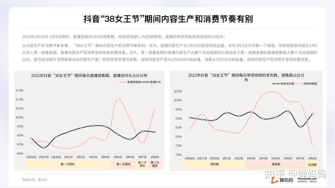 从内容生产和消费的节奏来看,“三八女王节”期间内容生产和消费的节奏不同;其中,直播内容的生产从2月28日开始,3月3日达到第一个高峰,而其销售在3月5日进入第一波,直播内容的生产明显领先于消费。