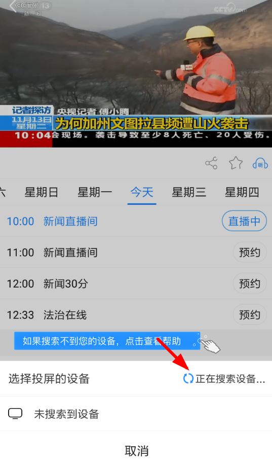 1、使用央视手机电视时,如果要将直播节目投屏到大屏,需要先搜索找到自己感兴趣的电视节目。