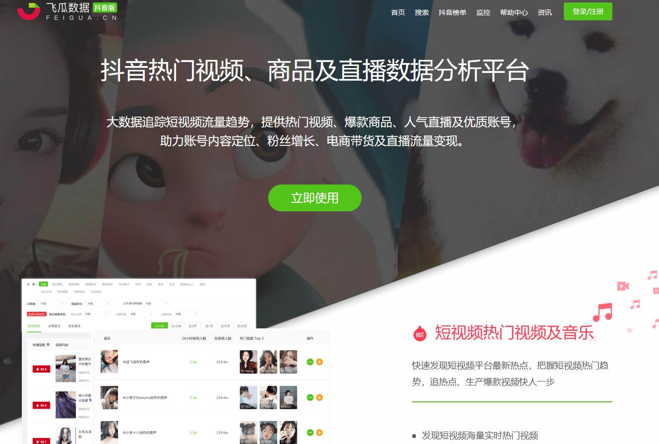 我正在使用的数据分析工具飞瓜数据,可以跟踪Tik Tok账号的数据,了解账号的运营情况,实时查询平台的热点和Tik Tok平台近期的货物数据,帮助你筛选热点产品。也可以了解一下最近抖音和爆款的视频,可以做个很好的参考。