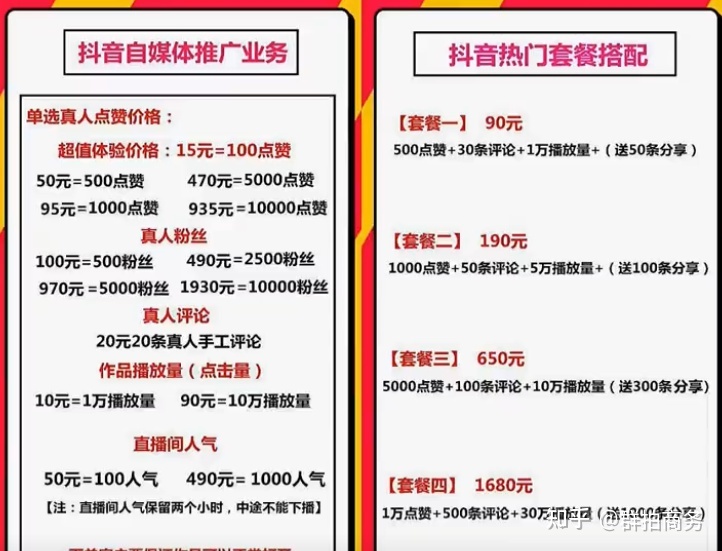 另外,你也看到了,我用了三个字来形容加入政府的好处。我为什么要强调这一点?因为市面上比较便宜,一张图告诉你这个行业的水有多深。这些赞、播、粉丝就不用说了,一点用都没有。他们没有官方的好。至少他们是真实的人,更不用说秋后算账可能会冷账。