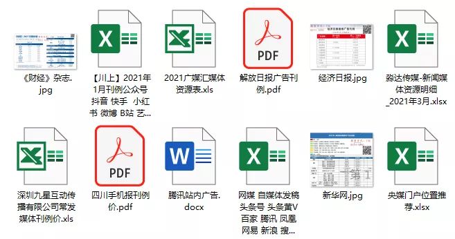 2022广媒汇媒体资源表.xls《财经》杂志.jpg【川上】2022年1月刊例公众号 抖音 快手 小红书 微博 B站 艺人合作 .xlsx中央媒体资源表.xlsx四川手机报刊例价.pdf央媒门户位置推荐.xlsx新华网.jpg深圳九星互动传播有限公司常发媒体刊例价.xls淼达传媒-新闻媒体资源明细_2022年3月.xlsx经济日报.jpg网媒 自媒体发稿头条号 头条黄V 百家 腾讯 凤凰 网易 新浪 搜狐 大鱼 一点 .xlsx腾讯站内广告.docx解放日报广告刊例.pdf长沙晚报内容概述