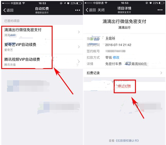 3)打开后,可以选择要停止自动扣款的项目,点击停止扣款。(如下图所示)