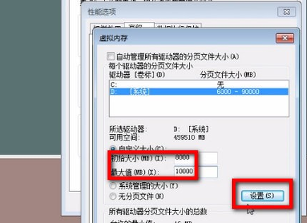 5、输入【Initial Size】和【Maximum】,点击【Set】按钮(虚拟内存设置的原则是:虚拟内存的最小值为物理内存的1~1.5倍;虚拟内存的最大值为2到2.5倍的物理内存倍数。),然后点击最下方的【确定】