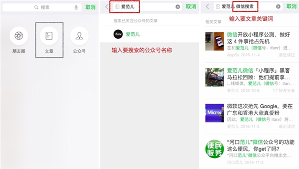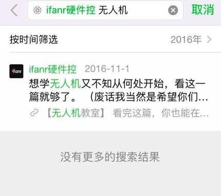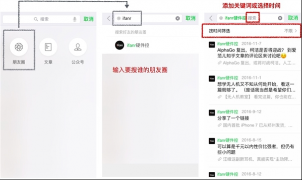 在“朋友圈”和“文章”两个搜索入口,微信有针对性地增加了搜索条件选项:搜索朋友圈时,可以搜索一个朋友的朋友圈;在搜索文章时,可以针对某个微信官方账号搜索某篇文章,还可以设置时间条件。