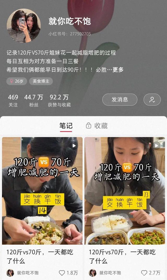 以“记录120斤姐妹花一起减脂增肥”为思路,整个过程少了些辛苦和枯燥,让它颇有故事性,同时对美食博主来说也有了一点轻美。这使得博主受到了很多粉丝的喜欢。