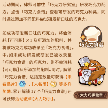 2.解锁“巧克力配方”至指定数字,即可获得“无名薯片”、“无名币”等各种奖励。共解锁17个巧克力配方,获得活动徽章【强力巧手】。