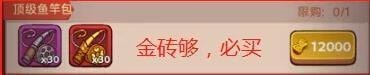 12000块金砖换30根金鱼竿和30根银鱼竿。在普通黑市,30根金鱼竿要一万两金砖,在这里送30根银鱼竿非常划算。购买后的黄金钓竿是需要计划和使用的,需要在完成一轮月活动后使用,才能达到最高的性价比。只要我们有足够的金砖,我们就会买。