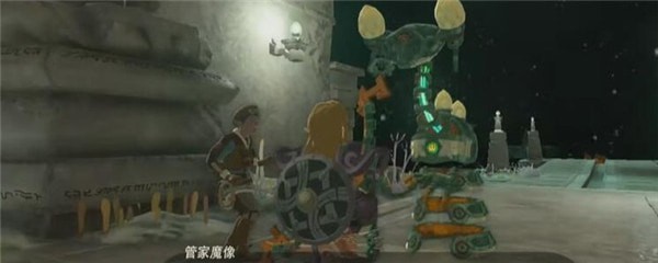 往右走就能看到传输点。可以通过和魔像管家对话来学习蓝图技能,修复右边这辆车的轮子。